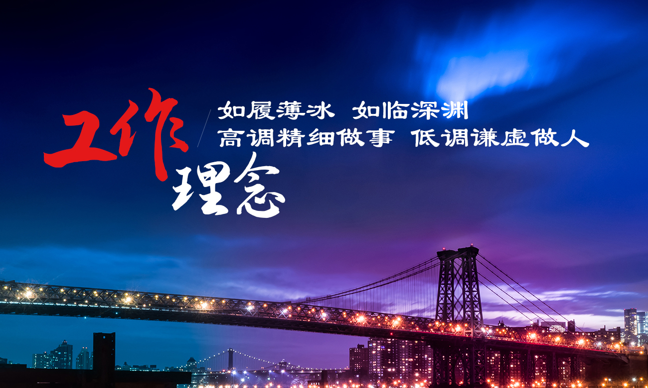 公司以建造合格建筑產品、助力國家建設為使命,以構建幸福企業為愿景。公司深知助力國家建設為使命所擔負的責任,故以“如履薄冰、如臨深淵、高調精細做事、低調謙虛做人”為工作理念,建立了完善的管理制度和質量保障體系,以人為本,構建和諧環(huán)境。公司牢固樹立安全意識、文明意識、質量意識、環(huán)境意識和精品意識。在公司質量管理過程中貫徹“雙百”方針:即工程合格率100%,客戶滿意率100%。以“建設一項工程,樹好一個形象,多出一份誠信,廣交一方朋友”為公司經營理念。